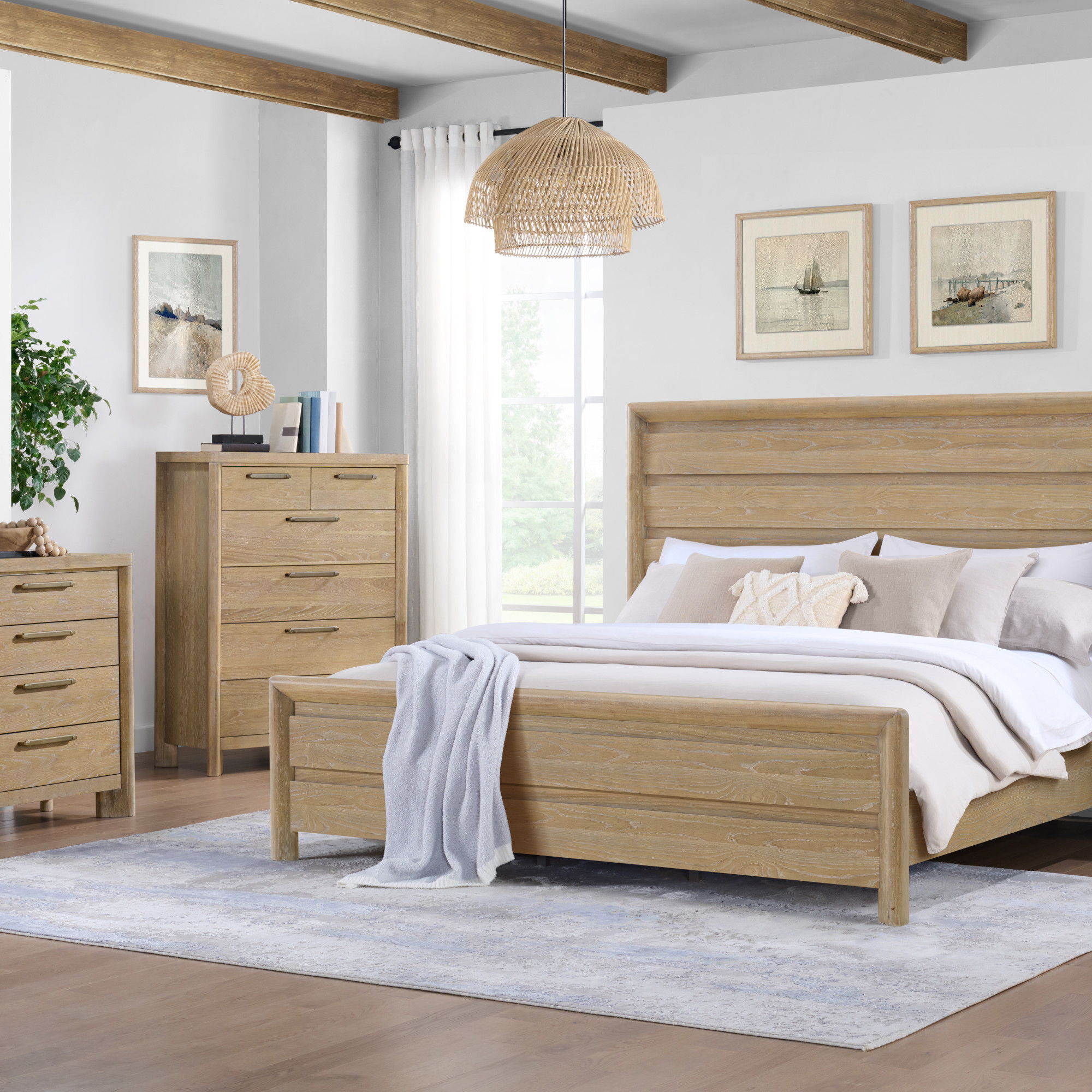 Bring the outside in with the light and airy, casual style of the Pacific Grove collection. Burnished and aged hardware accent the sand dune colored finish featuring light wire brushing, glazing, rasping, and sand-through. Outfit your whole bedroom with a panel bed, nightstand, chest, dresser, and mirror. You’ll find a perfect blend of modern, rustic, and coastal design aesthetics with the rounded shapes, and neutral tone. The Pacific Grove’s casual, yet sophisticated look will bring out the best in your space.