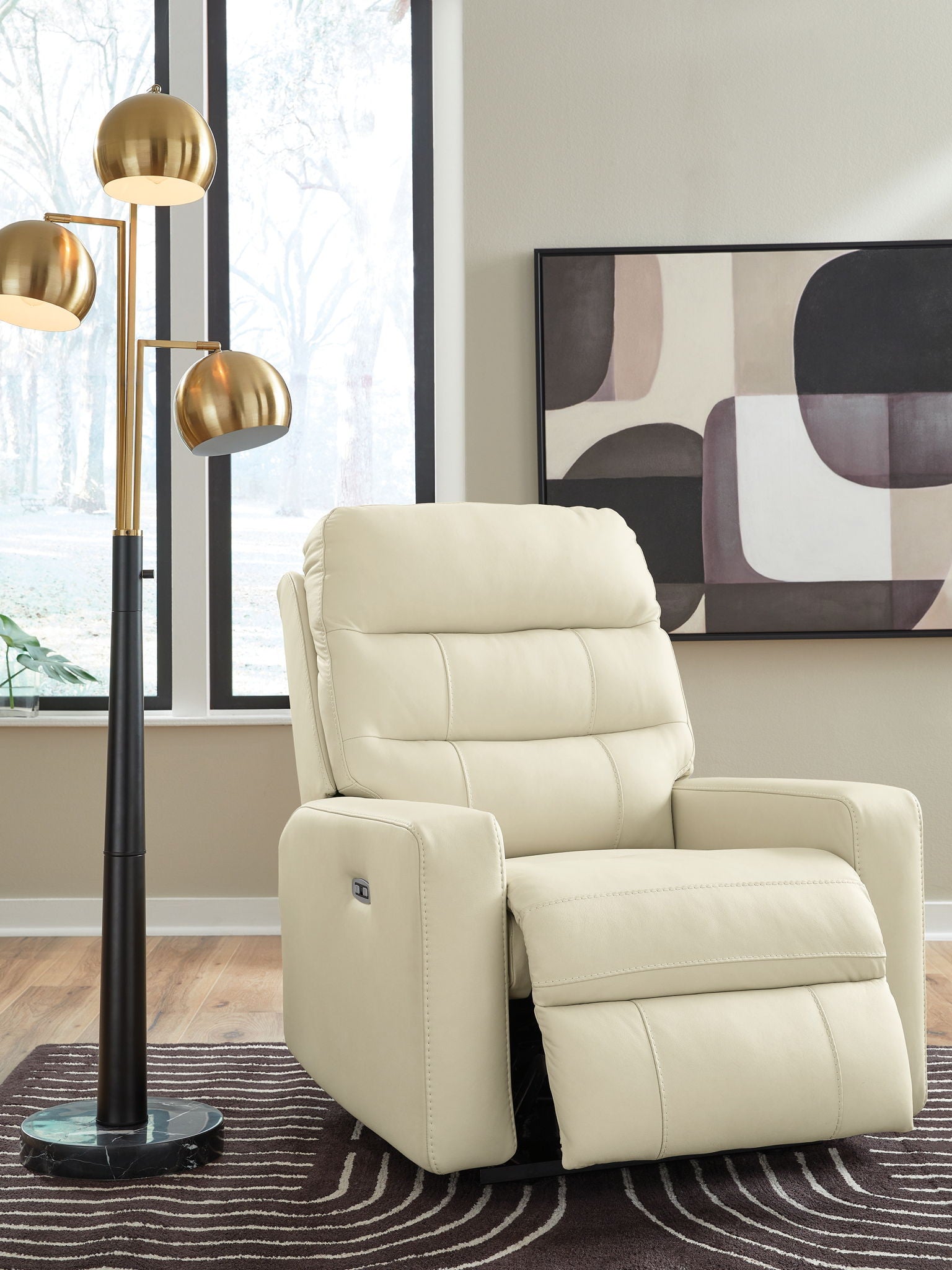 To those who think recliners can’t be chic and ultra contemporary, meet this stylish piece. With the touch of a button, you can easily position the power recliner and its adjustable headrest for maximum comfort. Nicely neutral leather upholstery, paired with expertly matched faux leather, brings a luxurious look to lounging on lazy Sunday mornings or napping any day you please. Wide track arms and sumptuous padding provide the ultimate mix of style and substance. And built-in USB charging lets you keep your devices powered up without having to leave this sumptuous seat.