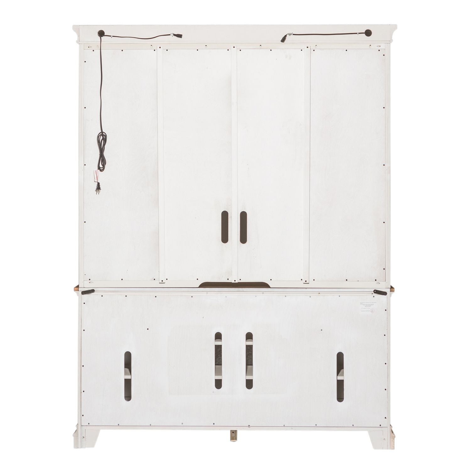 Combine traditional living and todays modern lifestyle effortlessly with the Morgan Creek entertainment center. Crafted with polar solids with pine and birch veneers, this piece features a two tone finish, wood framed doors, removeable side molding, adjustable shelving and led touch lighting to illuminate the piece. Wire management provisions effortlessly accommodates a DVD player or gaming console of choice. The warm antique finishes and artistic distressing along with grand scale, makes this a piece to be passed on to generations.