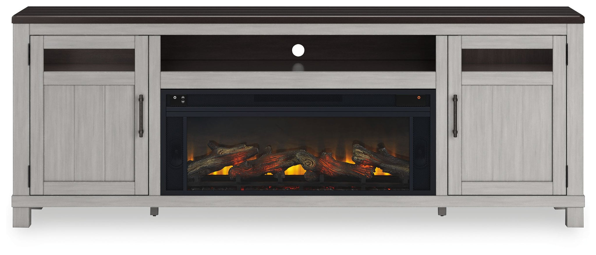 Make a farmhouse-inspired statement with this TV stand. It’s beautifully crafted to stand the test of time, with a planked effect and clean two-tone finish that lend a relaxing vintage feel. With two cabinets (each with an adjustable shelf) and an open cubby, it offers plenty of storage to house all your electronic needs. Enhancing the experience, the fireplace insert brings a touch of warmth and beautiful ambiance to your living room. With the touch of a button, adjust the temperature and the flame brightness, and connect your device to the built-in wireless speakers. The flame effect includes a realistic-looking log set with glowing embers, along with an ambient down light.