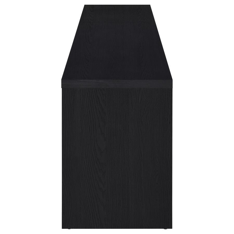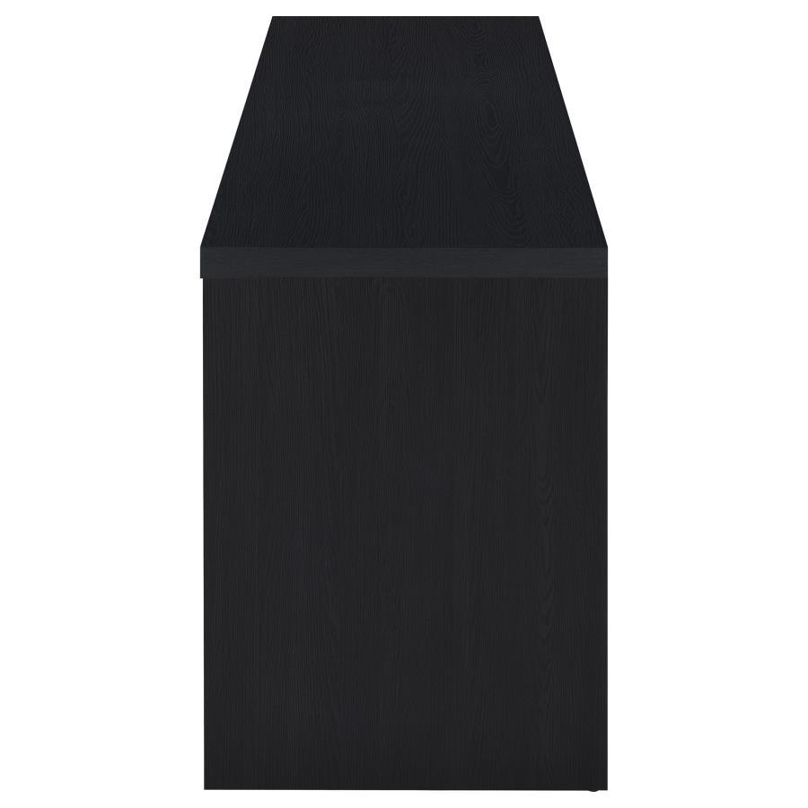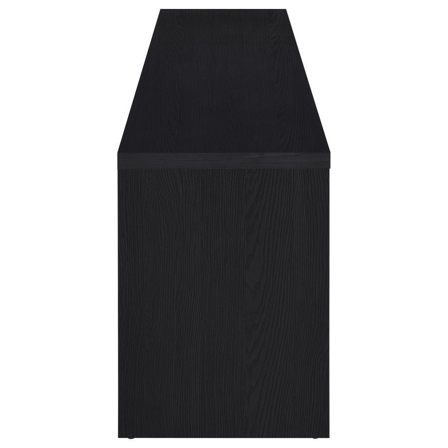 Upgrade your entertainment space with this black TV stand, crafted from engineered wood with a paper laminate veneer for durability and a sleek finish. The clean lines and modern design include open shelves for electronics, a wire management hole to reduce clutter, and three concealed drawers for organized storage. Perfect for flat-screen TVs, this media console combines style and functionality for any contemporary setup.
