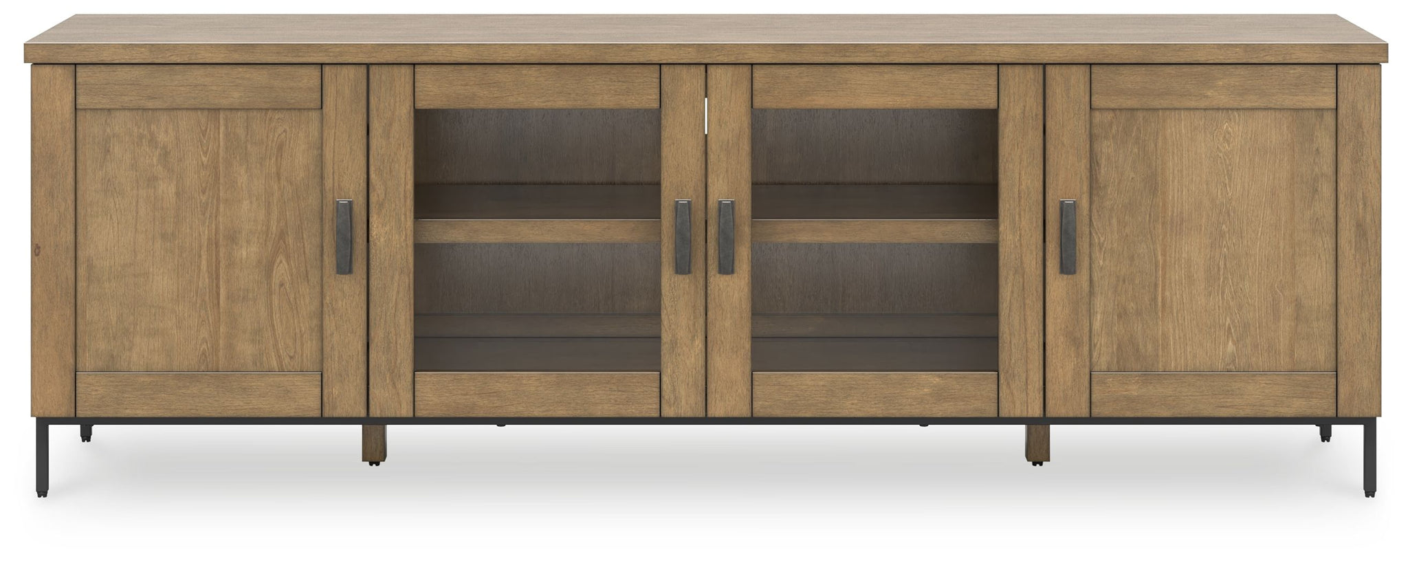 Made for the everyday, this TV stand is a sleek complement to your casual contemporary living room. You’ll love the refined-yet-relaxed vibe of its contrasting medium brown finish and matte black legs. Concealed and glass-front cabinets make media storage a breeze. And for added function, cord management holes throughout the piece make connections easier.
