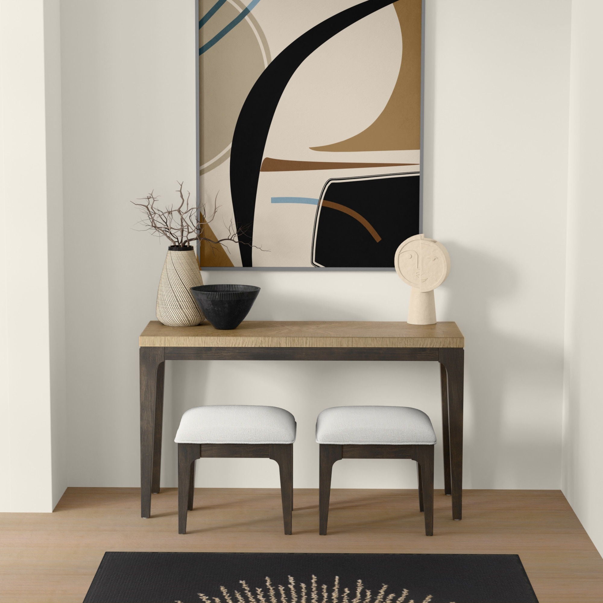 Product Features- The Sutton Place console table with 2 stools embodies relaxed contemporary style with a focus on the natural beauty of oak. Light wire-brushing enhances the tight-grain oak veneers, sturdily crafted over hardwood solids. Warm caramel tops beautifully contrast with rich cocoa legs, while a subtle diamond pattern on the table surfaces adds a touch of sophistication. Thoughtfully designed for both style and function, the collection includes a cocktail table, end table, and chairside table with a convenient storage drawer, with a lower shelf on each piece providing additional space for storage or display. A console table with optional stools offers extra seating when needed, seamlessly blending practicality with elegant design for a warm and inviting accent to your home..