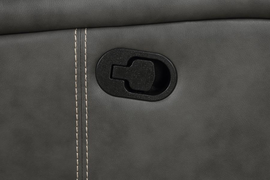 Merging the classic style of both contemporary and transitional design schemes, the motion sofa creates a dreamy venue for relaxing and entertaining. Choose a pleasing motion sofa covered in smooth grey leatherette upholstery with vertical topstitching adding decorative elements and a dimensional impact. This sofa features foam padding on its frame and in-pocket coil spring seat cushions, as attached back cushions are capped with ultra-plump headrests. Recline into varying positions using a manual control function, and enjoy space efficiency with its wall-hugger design. A timeless style and luxurious comfort converge to offer a multi-functional and beautiful piece for entertaining or solo relaxation.