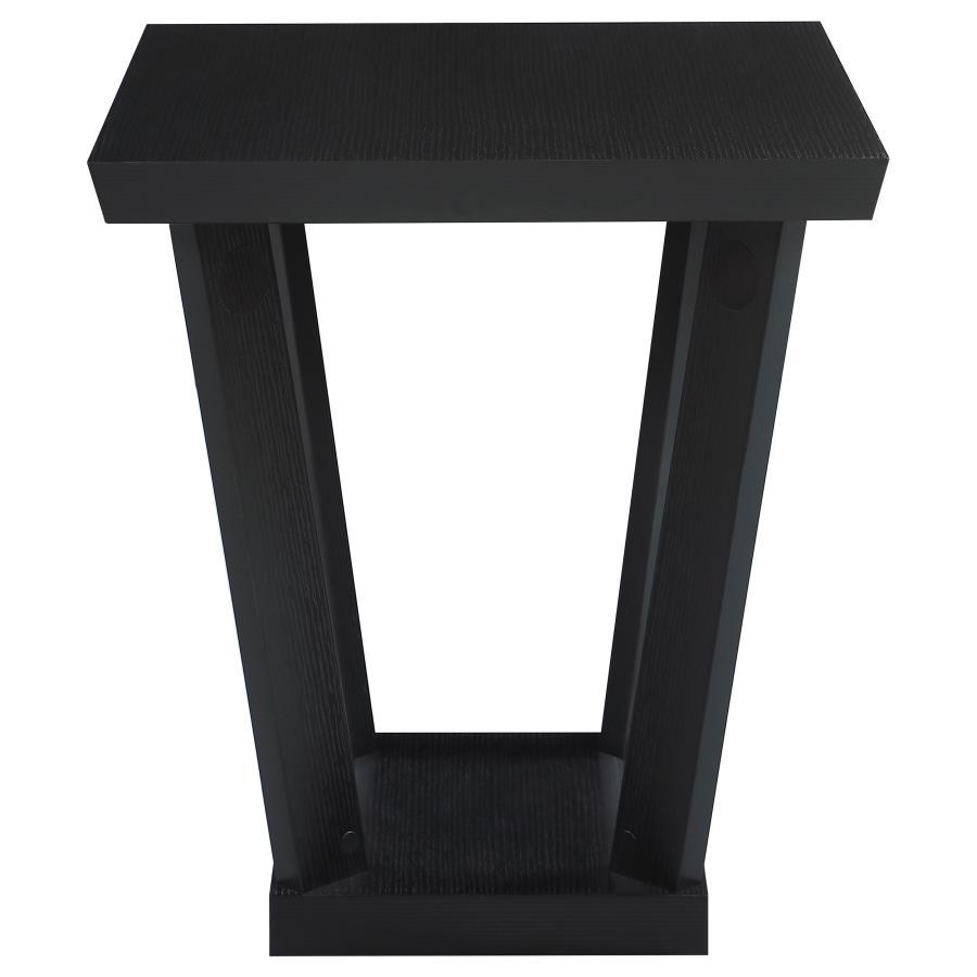 Create an ultra-modern feel with this set of three occasional tables, featuring a coffee table and two end tables. Designed with a black finish throughout each furniture piece, this modern three-piece occasional set lends a bold look to a space with their defined silhouettes. A smooth beveled top rests on plank style angled legs that extend into a flush squared base design. Each furniture piece also offers ample space above and below, with an open bottom shelf to store bins, baskets, or whatever clutter you need to contain. Arrange this modern coffee table and end tables within a contemporary home for a sleek and understated style.