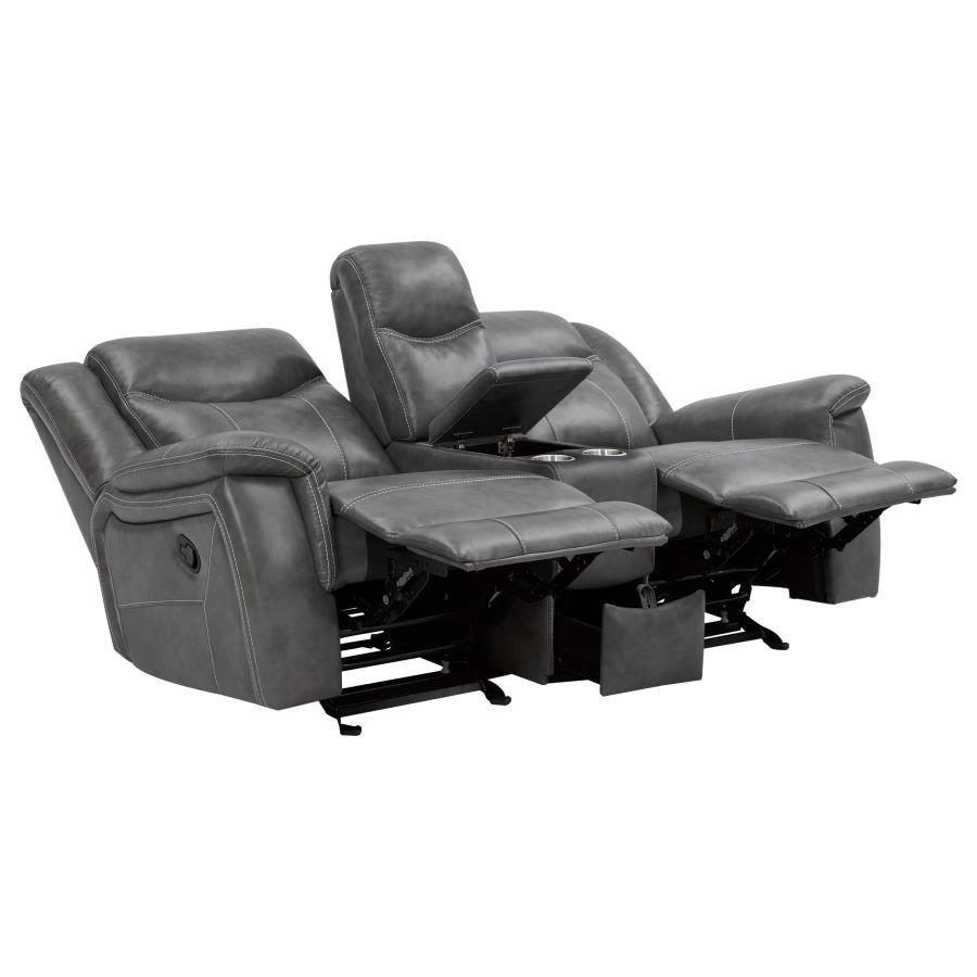 Grey is no longer drab and dreary and this decadent motion loveseat is proof. The angled seat backs feature extra padded headrests for optimal comfort. Padded armrests and recliner leg rest offer extra indulgence. Center console includes amenities like two cup holders and storage space. This loveseat comes wrapped in cool grey leather-like upholstery for a modern appeal.