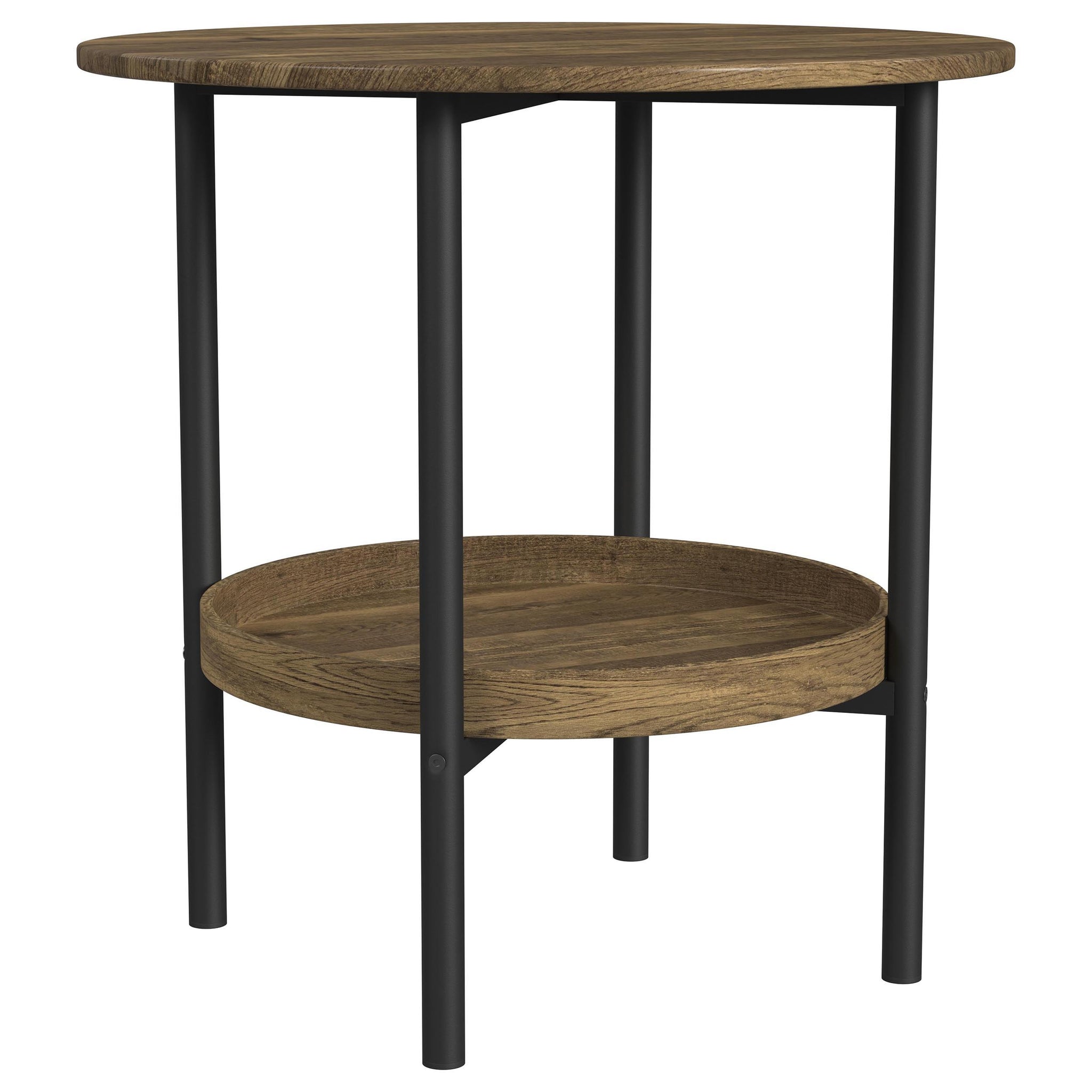 Complement your living space with the stylish, understated design of this transitional round end table. Its simple, clean lines exude farmhouse charm, with a neutral brown wood finish that brings warmth to any room. The round silhouette creates a sense of flow, while the full lower shelf, with its tray profile, offers a perfect spot for displaying your favorite decor or storing essentials. The black metal frame with tubular legs adds a crisp, classic touch to this versatile side table.